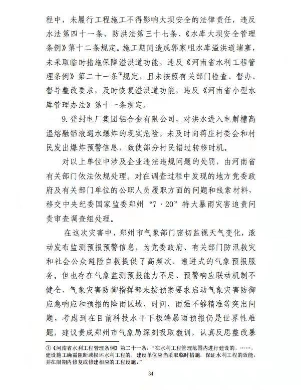 调查认定:这是一起由极端暴雨引发严重城市内涝,涝水冲毁停车场挡水围墙、灌入地铁隧道,造成14人死亡。郑州地铁集团有限公司擅自变更设计,未上报发改委审核,设计单位违规向施工单位提供白图,郑州地铁集团有限公司违规同意采用白图施工,施工单位违规采用白图施工,质监站未发现问题和缺陷,并出具了工程质量验收合格的监督意见。郑州市雨水管道仅2400余公里,196.3亿海绵投资,实际与海绵城市相关的仅占32%,用于景观、绿化等占近56%。