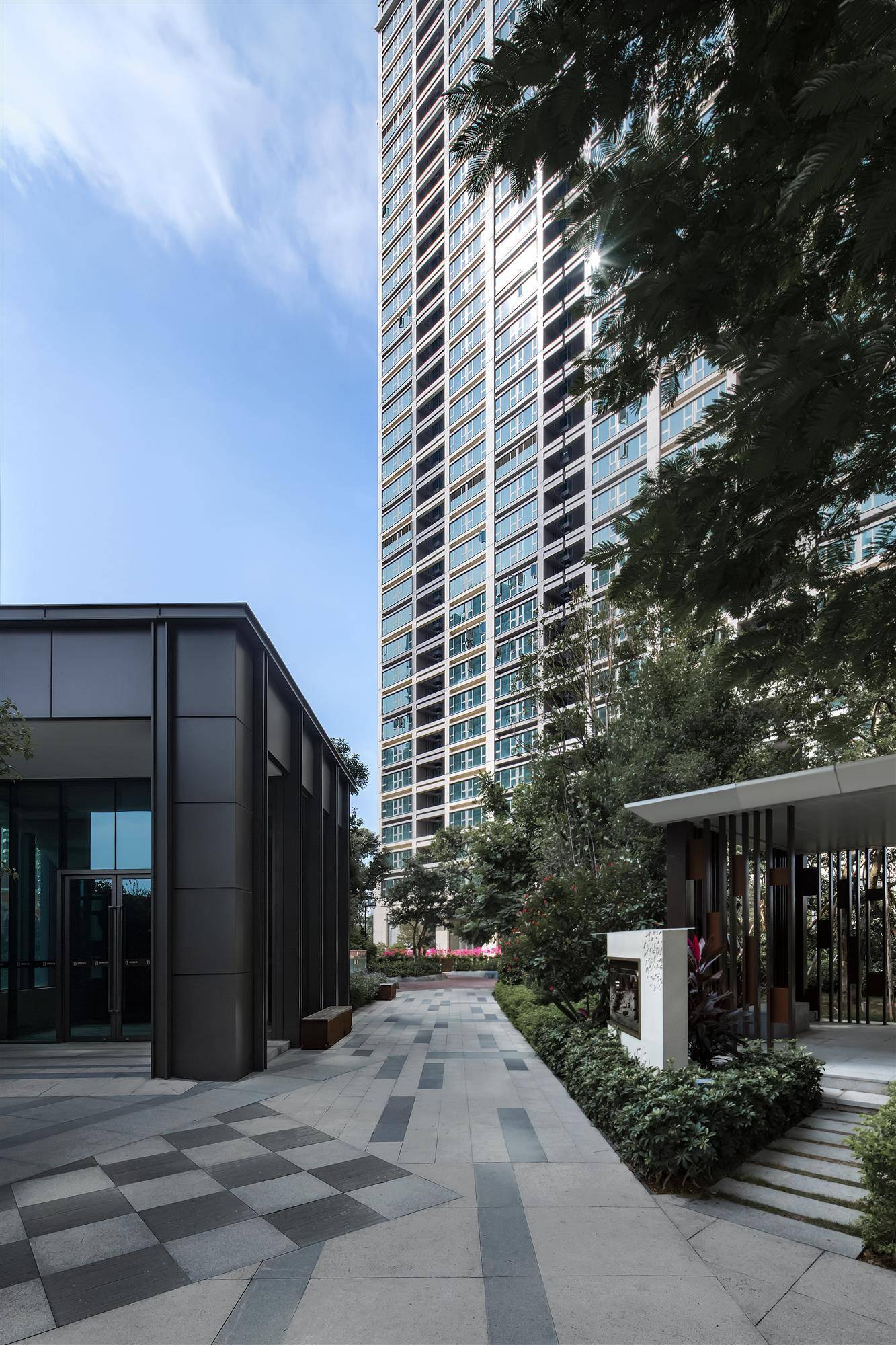 规考虑到用地狭小,深圳金领假日公寓顺应早期皇御苑社区规划肌理,在规划布局上打破长板布局,优先与南侧住区最大限度拉开间距,给城区提供喘息空间,保障区域阳光和通风,同时贴近北侧中心公园色,令住区以山脊之势同享南北两侧景色。3 栋塔楼建筑组群围绕南侧庭院呈半围合式布局,尽全力保留公庭院的完整和无干扰,形成合理楼距,将街角退让给城市,整体创造丰富的城市界面。